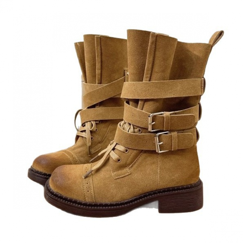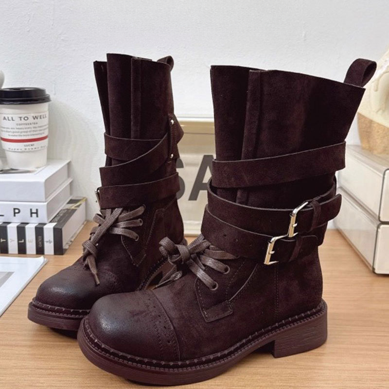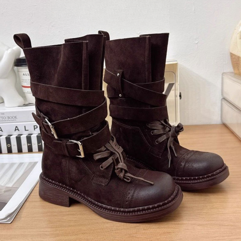 Women’s British Style Leather Buckle Mid-Calf Boots